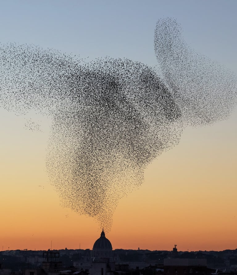Ogni uccello è in relazione con chi gli è più vicino; ogni minimo movimento si propaga, attraversa l’intero gruppo, lo influenza e allo stesso tempo ne viene influenzato.